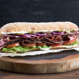 כריך רובן קלאסי נקניק כתף בקר עם מיונז, חרדל, עגבנייה, בצל סגול, חסה ומלפפון חמוץ